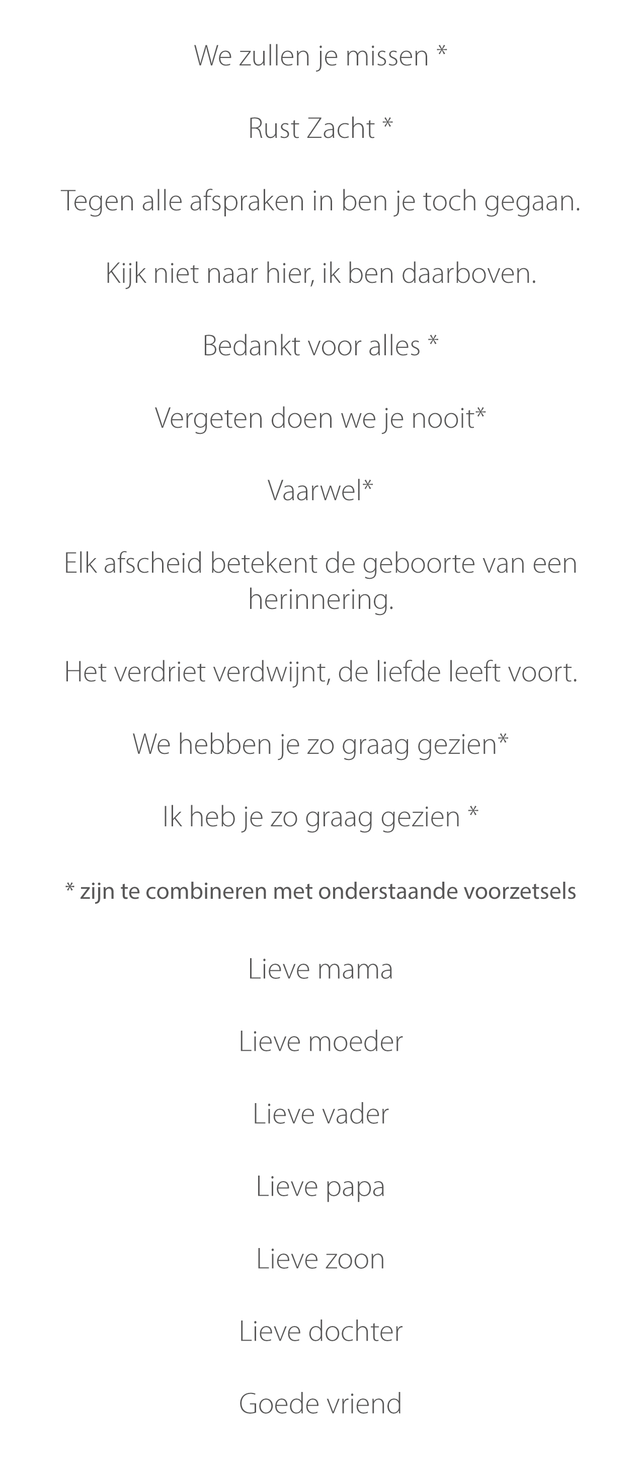 Les plaquettes texte sont disponibles en deux tailles standard, y compris le support en acier inoxydable. Vous avez le choix entre un nombre de fonds, textes et polices d'écriture standard. L'impression court toujours jusqu'au bords. En cuisant votre texte dans la couche d'émail vous pouvez laisser un message éternel sur la tombe.